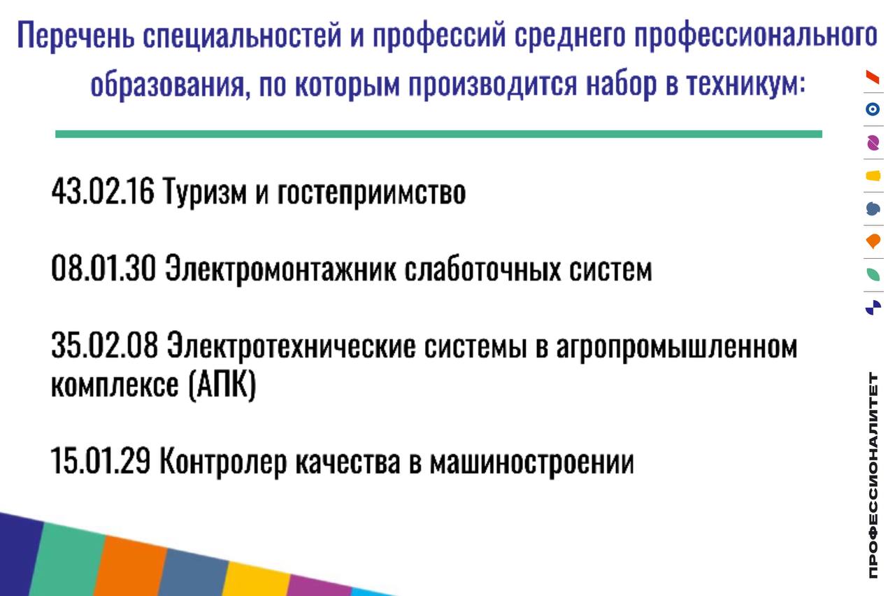 Прием заявлений в техникум на очную форму получения образования осуществляется до 15 августа, а при наличии свободных мест в техникуме прием документов продлевается до 25 ноября текущего года. Набор осуществляется по 11 различным направлениям подготовки.